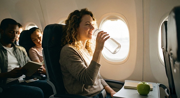 Uống đủ nước trong suốt chuyến đi giúp duy trì độ ẩm tự nhiên và cảm giác mềm mại cho da. Đây là bước cơ bản nhưng mang lại hiệu